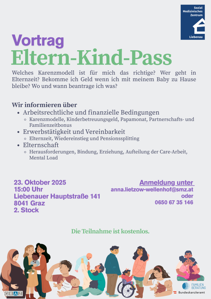 Informationsveranstaltung zu Themen rund um den Eltern-Kind-Pass im SMZ Liebenau aus der Veranstaltungsreihe „Eltern werden – Eltern sein“. Wir freuen uns über zahlreiche Teilnehmenden. Jegliche Familien- und Lebensformen sind herzlich willkommen!